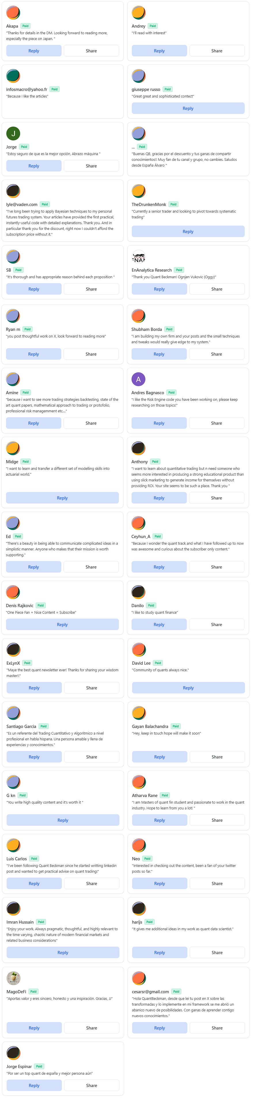 Through this newsletter, Iβm excited to share the insights, strategies, and behind-the-scenes moments that shape my work. Whether youβre a curious investor or a seasoned quant, Iβm here to challenge conventional thinking, inspire bold ideas, and guide you through the complex, ever-evolving world of quantitative finance.