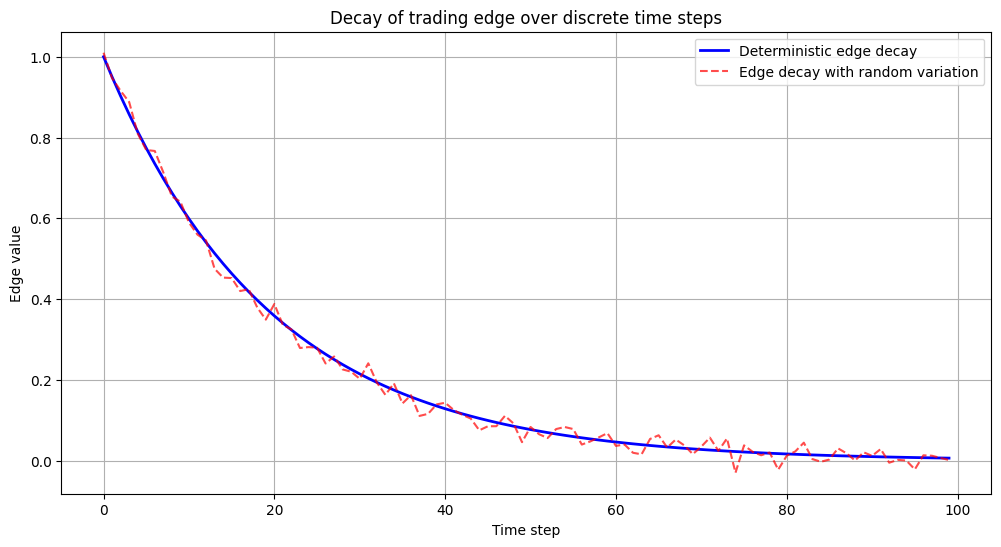 We can capture market dynamics with simple, discrete update rules. Consider a traderâs edge that decays over time as competitors catch on. A straightforward model is given by: