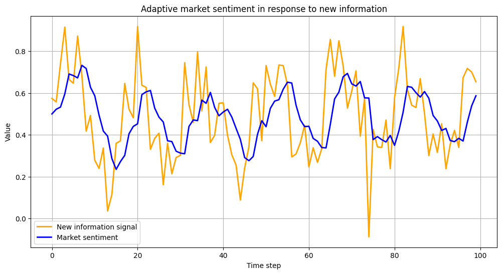 While it is impossible to capture all facets of market adaptation in one equation, a simplified model can illustrate the concept. Consider the following discrete-time update rule that models the adjustment of market sentiment in response to a trading signal: