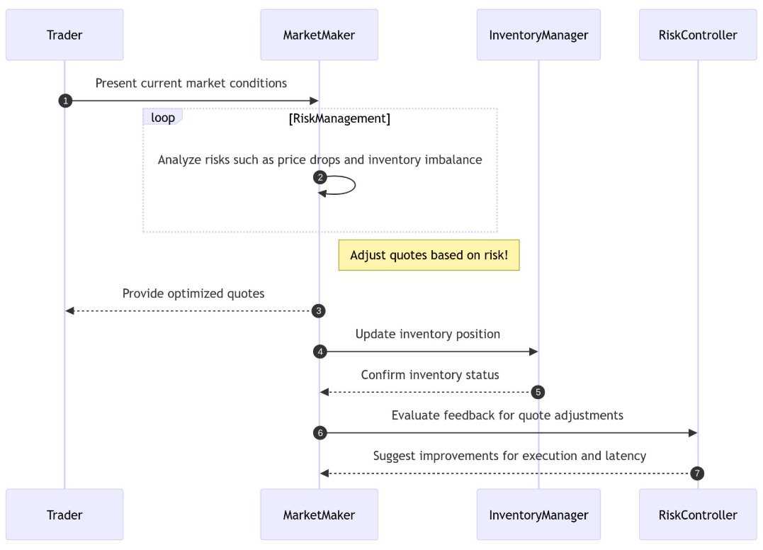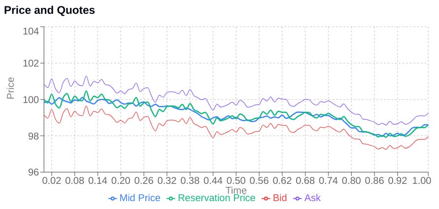 Another important point here is the optimal quotes. Once the reservation price is established, the optimal bid and ask quotes are derived. These quotes represent the prices at which the market maker is willing to transact, symmetrically placed around the reservation price but influenced by market dynamics beyond simple mid-point deviations.