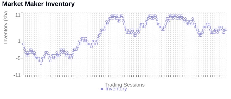 \(\begin{aligned} &\text{Original:} &&\gamma(t) = \gamma,\\ &\text{Enhanced:}&&\gamma_{\rm dyn}(t) = \gamma_0\Bigl[1 + \bigl(I(t)/I_{\max}\bigr)^2\Bigr]. \end{aligned}\)γ is no longer a constant. You scale it up as your inventory moves closer to its hard limit. A trader with near‐zero inventory can afford to quote tight and chase P&L. But once you’ve bought or sold a lot, you’re exposed, so you become more risk-averse, widening spreads to discourage further accumulation and protecting against big adverse moves.