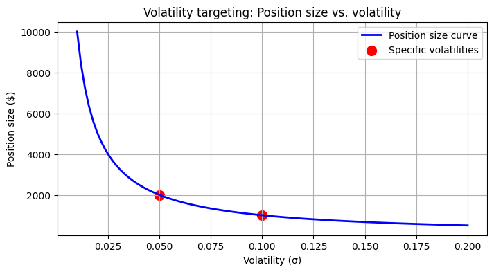 print(f"Position size at 5% volatility: ${pos_size_low:.0f}")