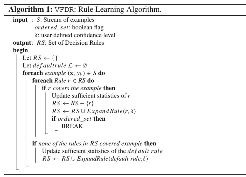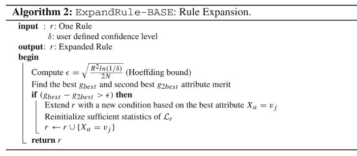 In VFDR, let hat ฮผโ denote the empirical performance measureโe.g., accuracy or information gainโof a decision rule after nnn samples. The algorithm uses the Hoeffding bound to check whether the difference between the best candidate rule and the second-best candidate is statistically significant. When: