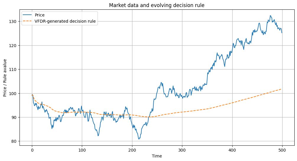 plt.title("VFDR Simulation: Market Data and Evolving Decision Rule")