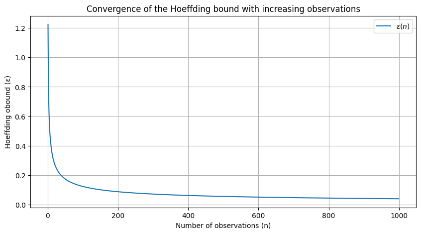 Visualize how the Hoeffding bound (ฮต) decreases with more observations.