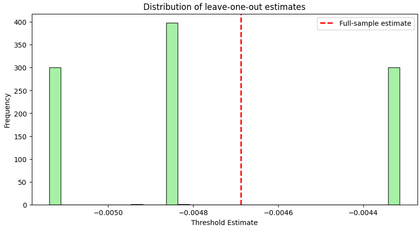 In the resulting histogram, the red dashed line indicates the full-sample estimate Tfull. The spread of the leave-one-out estimates reveals the inherent variability of our data—and thus the uncertainty in our threshold estimation.
