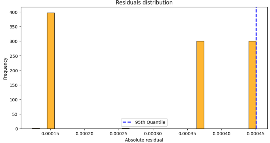 Next, by computing the (1−α) quantile of the residuals—for example, the 95th percentile when α=0.05—denoted q1−α, we define the prediction interval as
