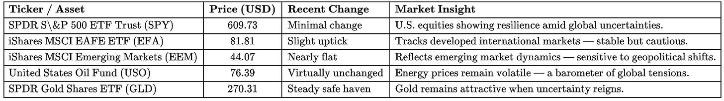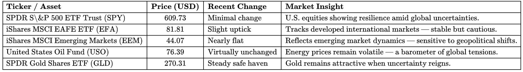 Take the SPDR S&P 500 ETF Trust, currently trading at 609.73 USD. Despite the whirlwind of geopolitical events, SPY has shown surprising stability—an indication of robust U.S. corporate earnings and investor confidence. It’s as if the U.S. market is saying, “We’ve seen it all before, bring on the drama!”
