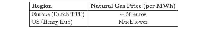 European natural gas prices are soaring—three to four times higher than in the U.S. For example, Dutch TTF gas futures are around 58 euros per megawatt hour, while U.S. prices at Henry Hub remain much lower. High energy costs are putting pressure on industries, making manufacturing and data center operations significantly more expensive. It’s like running a factory where every kilowatt-hour costs as much as a Michelin-starred meal.