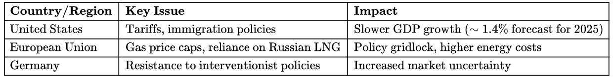 In Europe, internal divisions complicate matters. Divergent views on energy, fiscal policy, and industrial support often lead to policy gridlocks. Some countries, like Germany, are skeptical about interventionist measures such as gas price caps, fearing they might undermine market confidence.