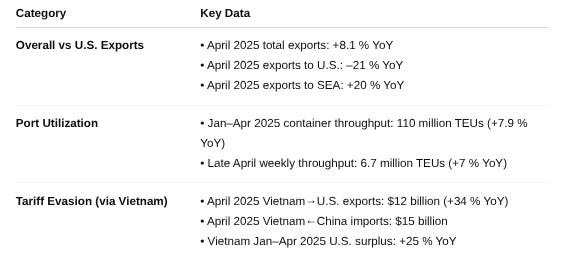 China’s overall exports have continued to grow in 2025 even as exports to the United States plunge, indicating a significant trade flow divergence. Chinese ports remain busy—container throughput +7.9% YoY in Jan–Apr—but much of the volume is being redirected to other countries. Evidence suggests China is rerouting goods via Vietnam, Indonesia, Malaysia and others to evade U.S. tariffs.