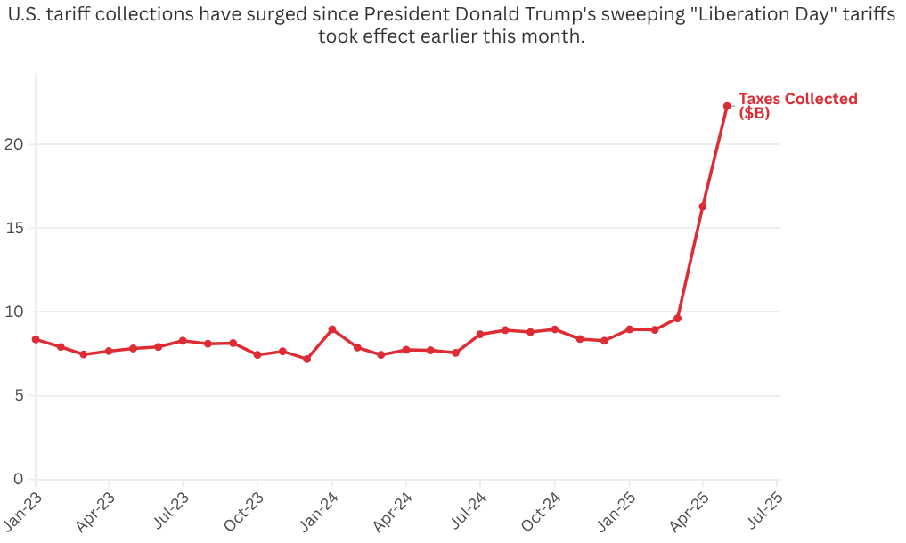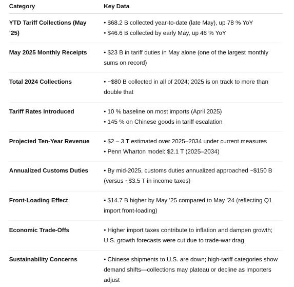 The U.S. government has collected unprecedented tariff revenues in 2025. As of late May, tariffs brought in around $68.2 billion year-to-date, up 78% from the same period in 2024. For perspective, by early May the take was $46.6B, that is 46% higher YoY and the pace accelerated through May. This puts 2025 on track to easily double the ~$80 billion collected last year. The spike is directly tied to new tariffs that took effect in April: President Trump raised import duties on dozens of countries, 10% baseline on most, 145% on China in a tariff escalation. Importers front-loaded purchases in Q1 and are now paying the piper in tariffs. May 2025 alone saw about $23B in tariff duties, a massive inflow and one of the largest monthly sums on record.
