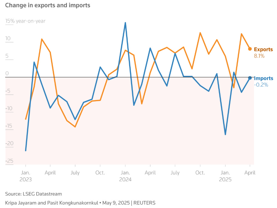 In April 2025, China’s total exports rose 8.1% year-on-year, beating expectations. By contrast, exports to the U.S. fell 21% YoY. This dynamic has widened as U.S. tariffs bite. Exports to Southeast Asia jumped ~20% in the same month, offsetting U.S. declines. The result: China’s export growth remains positive, while its U.S.-bound trade has shrunk sharply.