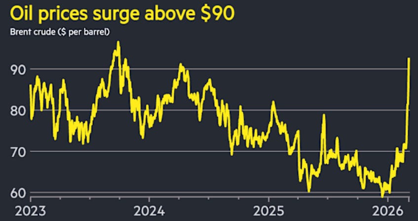 Price action in crude and refined products has reflected a risk-premium regime. In early March, Brent traded in the mid-to-high eighties and moved into the nineties in subsequent sessions, while U.S. benchmarks also rose with large daily moves. A key market feature is convexity: small changes in expected duration of disruption can produce large changes in expected supply deficit, inventory draw rates, and implied volatility in oil options.