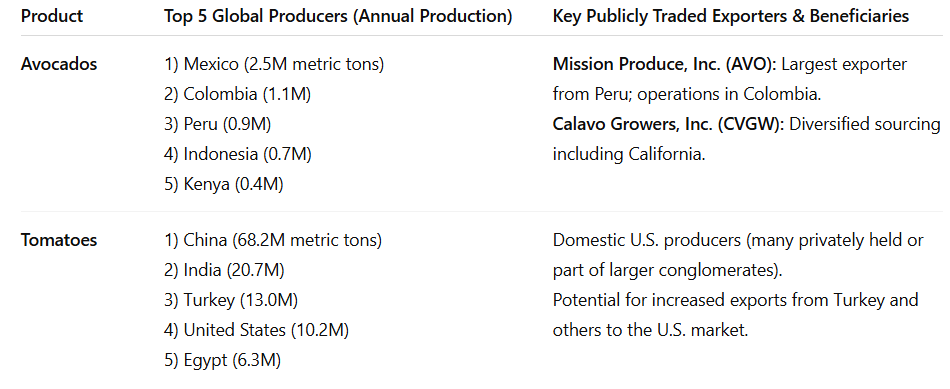 This dislocation creates a clear structural opportunity for Mexico's primary agricultural competitors. In the global avocado market, Colombia and Peru rank as the second and third-largest producers, respectively, and have been rapidly increasing their export capacity to markets in Europe and the United States. In the tomato market, while the U.S. has substantial domestic production, sustained price increases or supply interruptions from Mexico would benefit American producers as well as other global exporters like Turkey. For mangoes, key competitors poised to capture market share include India, China, and Thailand.