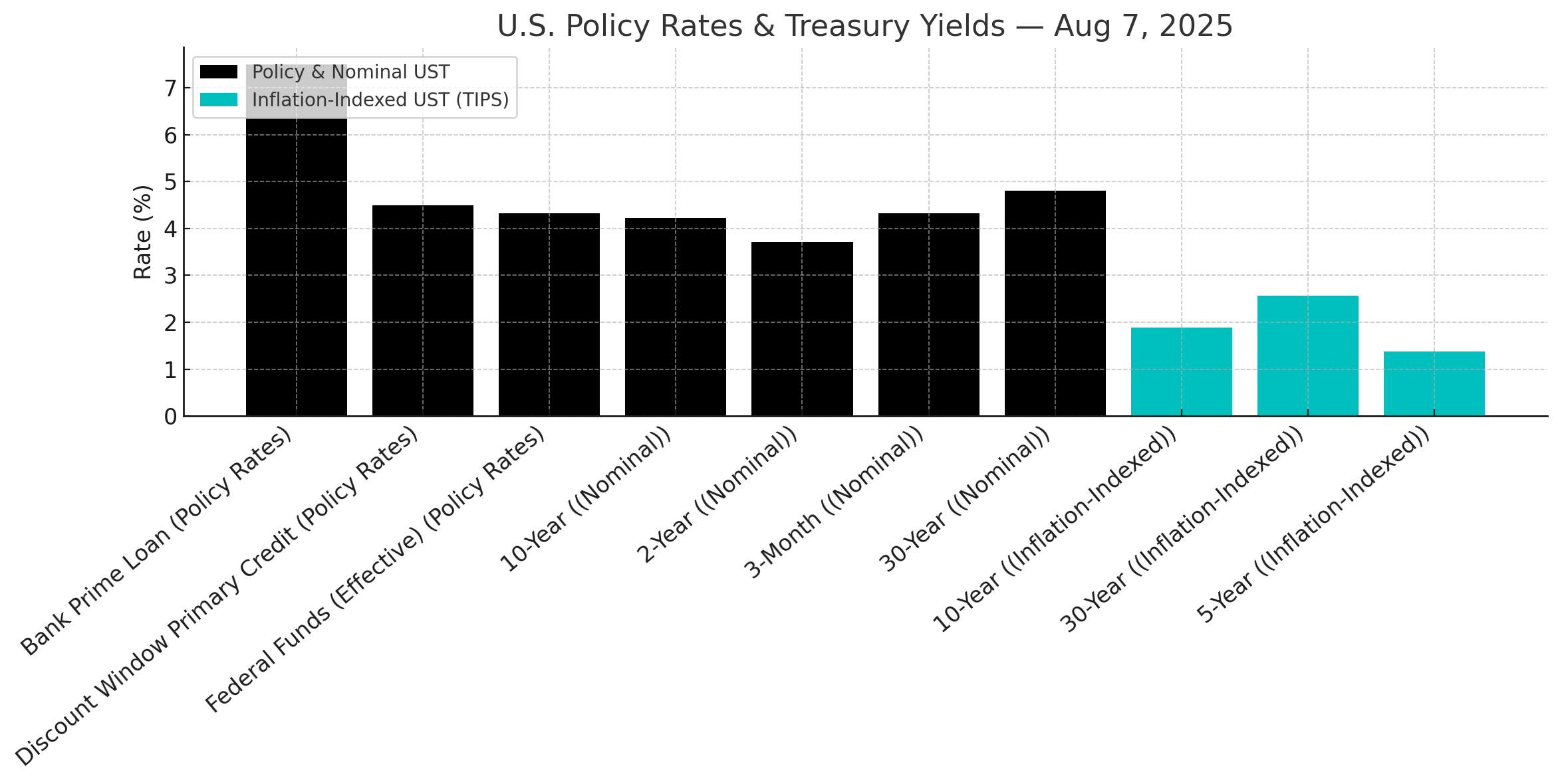 In the fixed income market, the U.S. Treasury yield curve is signaling caution. As of August 7, 2025, the yield on the 3-month Treasury bill was 4.32%, while the 10-year Treasury note yielded 4.23%. This slight inversion, where short-term rates are higher than long-term rates, is a classic market indicator of concern about future economic growth. For investors, the Fed's higher for longer stance, necessitated by inflation, makes short-duration government debt an attractive option for generating yield with relatively low price risk. However, the elevated risk of a policy error by the Fed or a sudden geopolitical shock could trigger a rapid flight to safety, which would cause a rally in long-duration bonds (i.e., their prices would rise and yields would fall). A balanced approach, with exposure to both the short and long ends of the curve, may be prudent.