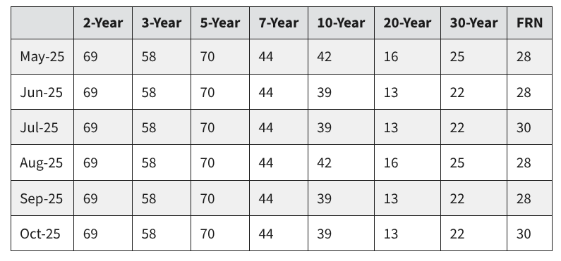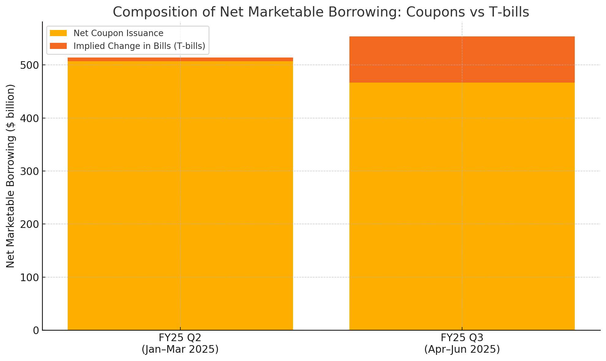 The scale of these financing needs is substantial. For the July β September 2025 quarter alone, the Treasury projects it will need to borrow $1.007 trillion in privately-held net marketable debt. To meet this demand without increasing long-term issuance, the Treasury will rely exclusively on adjusting the auction sizes of short-term T-bills and, if necessary, cash management bills. This is not a temporary adjustment but a sustained strategy. Projections from primary dealersβthe large financial institutions that underwrite and trade directly with the Treasuryβindicate a broad expectation that increases in coupon issuance will not occur until 2026 or later.
