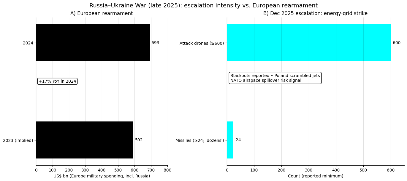 Russia’s invasion of Ukraine, now nearing its fourth year, remains a central source of geopolitical risk. After a grueling war of attrition through 2024–2025, recent developments signal escalation rather than resolution. Just this week, Russia launched an unprecedented massive attack on Ukraine’s energy infrastructure, firing over 600 attack drones and dozens of missiles in a single overnight barrage. Ukrainian officials condemned it as a deliberate attempt to cripple the power grid on the eve of Christmas, and indeed widespread blackouts were reported. The strikes were brazen enough to prompt Poland to scramble fighter jets to protect its airspace, underscoring persistent fears of spillover into NATO territory.