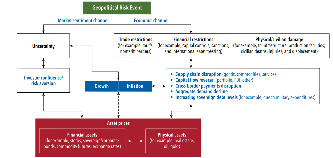 A useful way to frame the current environment is through transmission channels. Geopolitical shocks typically reach markets through energy and broader commodity pricing, inflation expectations and the policy reaction function, trade, tariffs, and supply-chain constraints, financial conditions and risk appetite, and regional stability and fiscal trajectories. These channels interact: a commodity spike can reawaken inflation at the same time that confidence weakens, producing a stagflationary mix; sanctions or blockades can fragment trade flows, raising costs and volatility even if headline growth remains positive; and fiscal demands linked to defense, subsidies, or industrial policy can reshape bond-market dynamics and term premia.