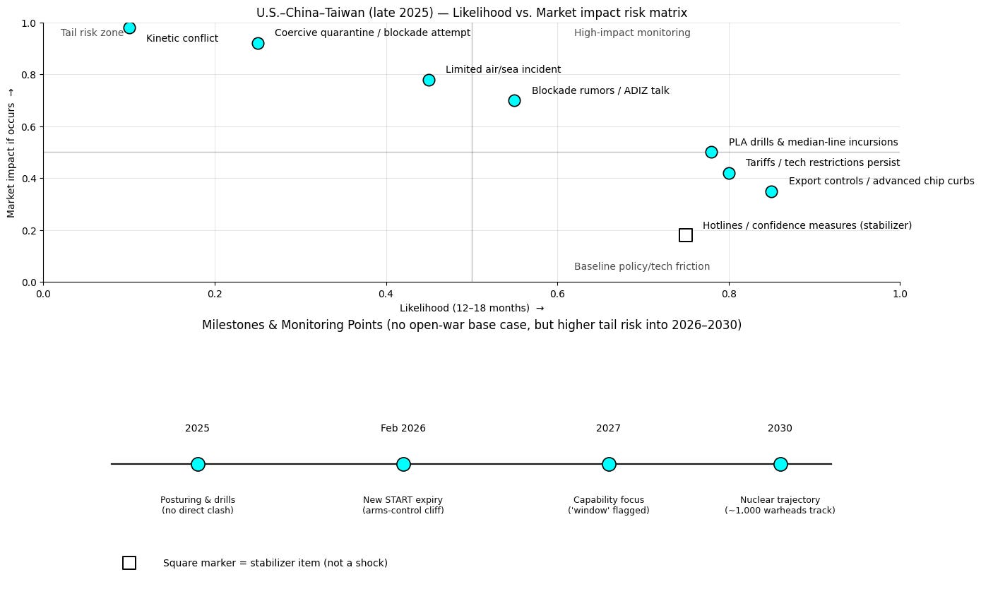 For investors, the U.S.-China rivalry presents a complex risk. In the near term, it’s manifested in export controls (U.S. curbs on advanced chip exports to China), investment restrictions, and supply-chain diversification – impacting tech sectors and emerging Asia markets. The tail risk, though, is a crisis over Taiwan that could disrupt global trade (Taiwan’s semiconductor exports are vital, and conflict could sever shipping lanes across the Indo-Pacific). Even short of war, military posturing or sanctions can roil markets – for instance, rumors of a blockade or an air defense identification zone over Taiwan would likely spark a global sell-off and flight to safety. Thus, the U.S.-China-Taiwan triangle is a critical focus for scenario analysis as we look into 2026.