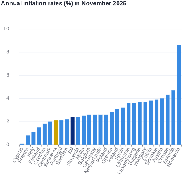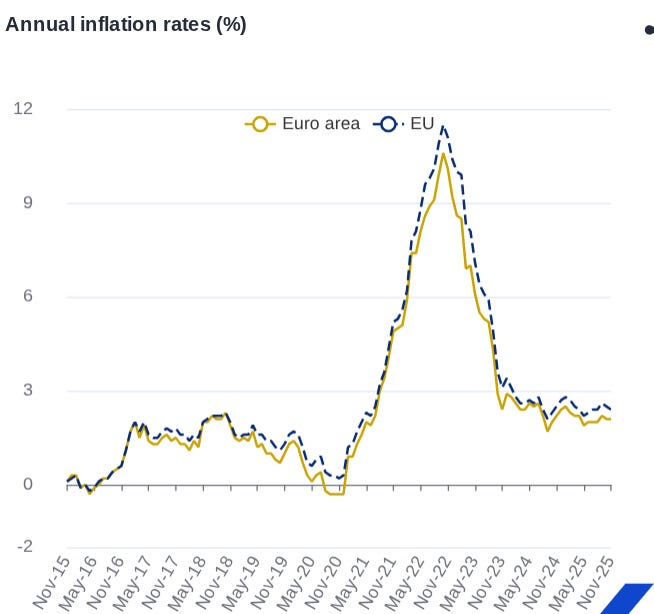 Inflation and monetary policy: The inflationary storm that rocked the world in 2022–2023 (fueled in part by war-related commodity spikes and supply disruptions) has largely subsided by late 2025. Headline inflation in the U.S. is back near 3% (2.7% YoY in Nov 2025), and in the euro area ~2.1%– a dramatic improvement from double digits two years prior. The easing of energy costs has been a major driver of this disinflation. Cheaper oil and gas directly lower fuel and utility prices; indeed, European energy prices in 2025 are contributing negatively to inflation on net. Additionally, supply-chain pressures have abated, and higher interest rates from central banks cooled demand.