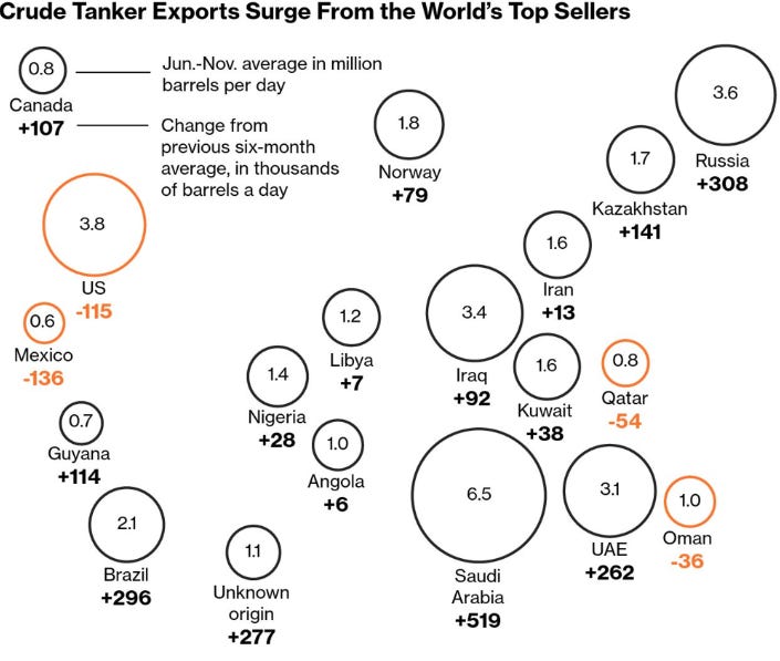 Energy supply and prices: Geopolitics has been a major driver of energy prices since 2022. The Russia-Ukraine war initially sent oil and natural gas prices soaring in 2022–2023, as Russian exports were curtailed and Europe scrambled for alternate supplies. However, by late 2025, the dynamic has reversed into a surprising oil glut. High prices incentivized massive supply responses: OPEC+ producers (including Saudi Arabia and even sanctioned Russia and Iran) increased output, and non-OPEC sources surged. Brazil’s oil production hit record highs in 2025, U.S. shale output reached a fresh peak under Trump’s pro-drilling agenda, and even newcomer producers like Guyana and new fields in Africa ramped up exports. Meanwhile, global demand growth has been moderate. The result: global oil inventories swelled, with a record 1.3 billion barrels afloat on tankers worldwide. Benchmark Brent crude prices are on track for their biggest annual drop since 2020, down about 20% this year to the ~$60 range. Gasoline in the U.S. has fallen below $3/gallon on average – a welcome relief for consumers and a political win for Trump.