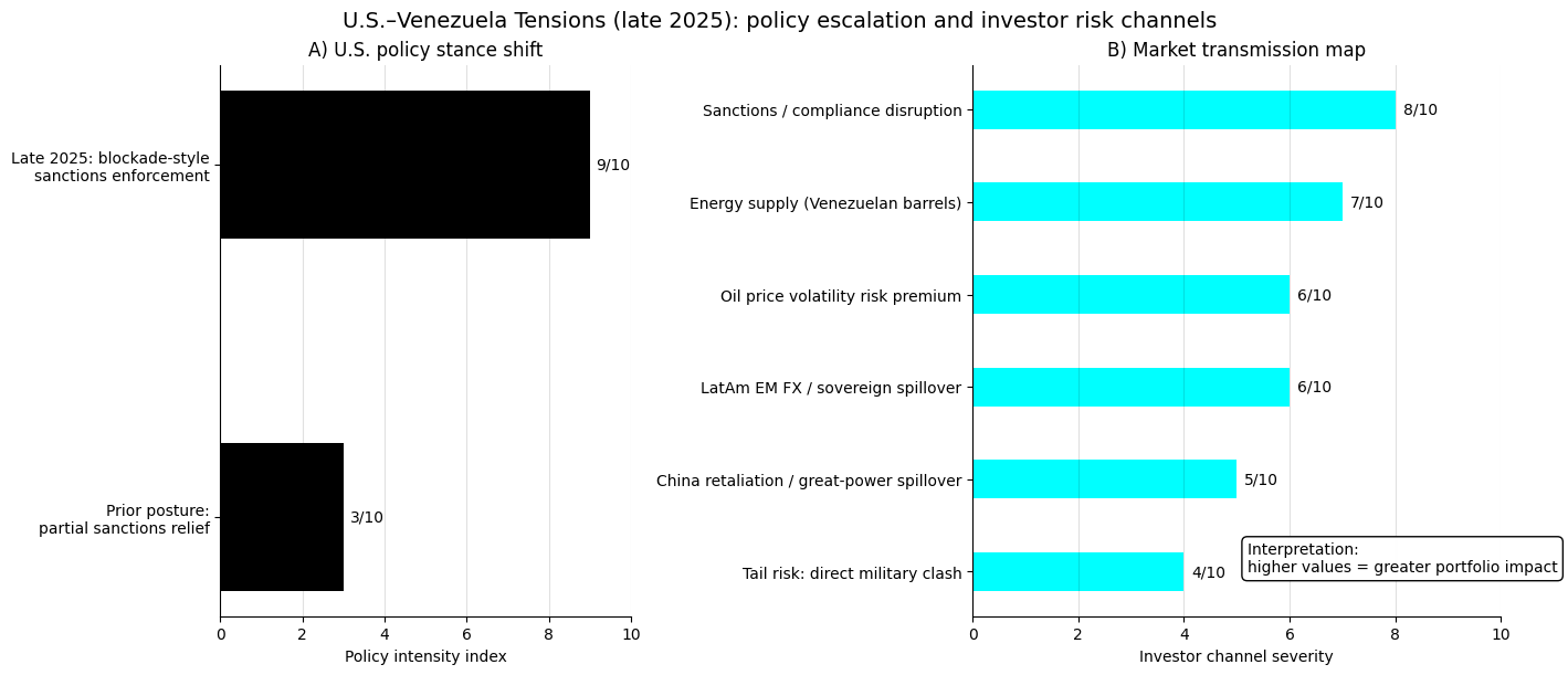 For now, a direct U.S.-Venezuela military clash has been averted, and Venezuela’s beleaguered economy struggles on under tightened sanctions. But political risk is high: 2024’s postponed Venezuelan elections and any regime-change attempts (internal or external) in 2026 could lead to unrest or conflict. For investors, this raises concerns about energy supply (Venezuela’s oil output and the broader oil price impact) and emerging-market exposure in Latin America (sovereign risk, currency volatility, etc., especially if U.S. actions spark sanctions or proxy conflicts involving regional players like Cuba, Nicaragua, or even a split within OPEC). U.S.-Venezuela tensions thus represent a new front of geopolitical risk emanating from the Western Hemisphere.