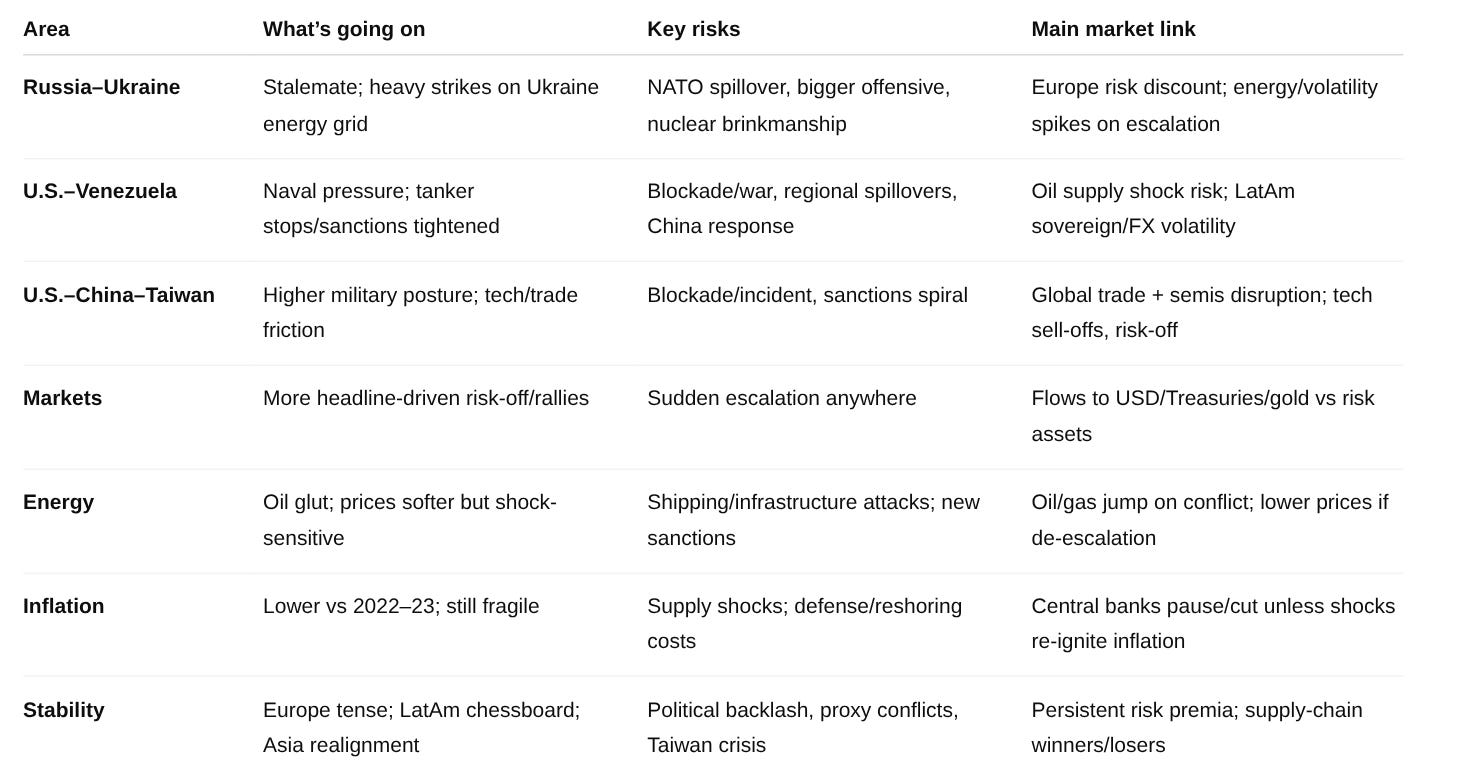 The information ahead organize the investment problem around three active theatres—Russia–Ukraine, U.S.–Venezuela, and U.S.–China/Taiwan—and then connect them to market implications for risk sentiment, energy balances, inflation paths, and stability. The objective is to move toward decision structure: