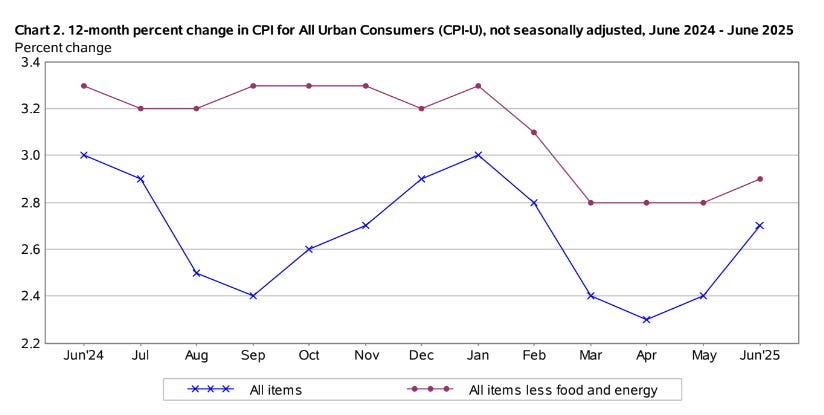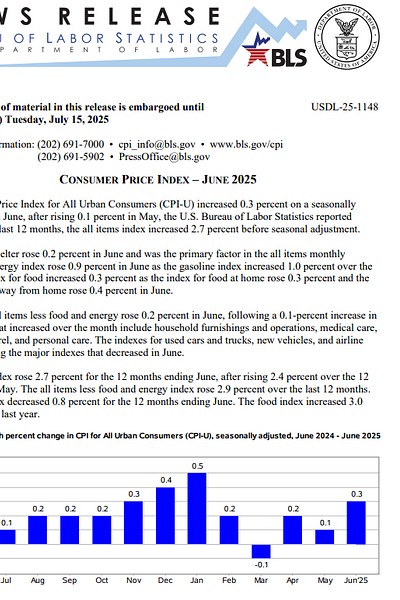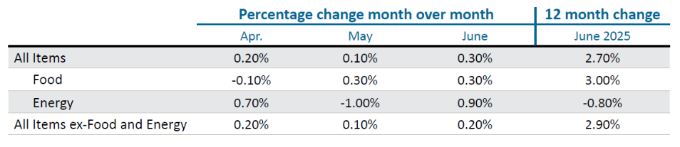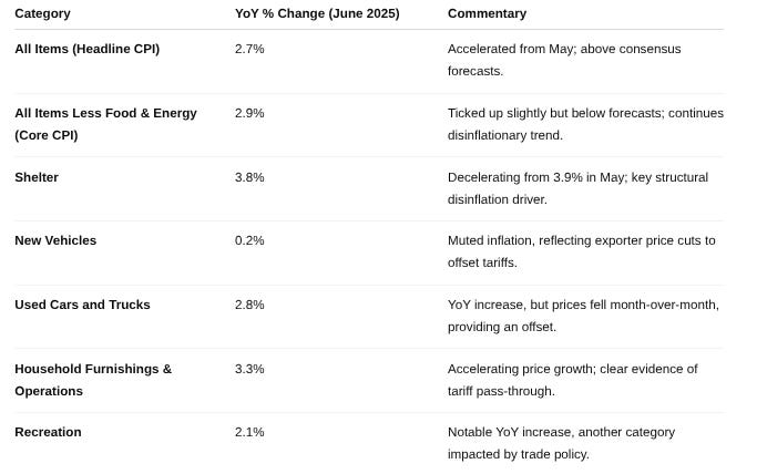 The headline Consumer Price Index for All Urban Consumers rose 0.3% month-over-month (MoM) in June, an acceleration from the 0.1% rise in May. On a year-over-year (YoY) basis, headline inflation increased to 2.7%, the highest reading since February and above consensus forecasts of 2.6%. This uptick reversed several months of cooling inflation and, on the surface, presents a challenge to the disinflation narrative.