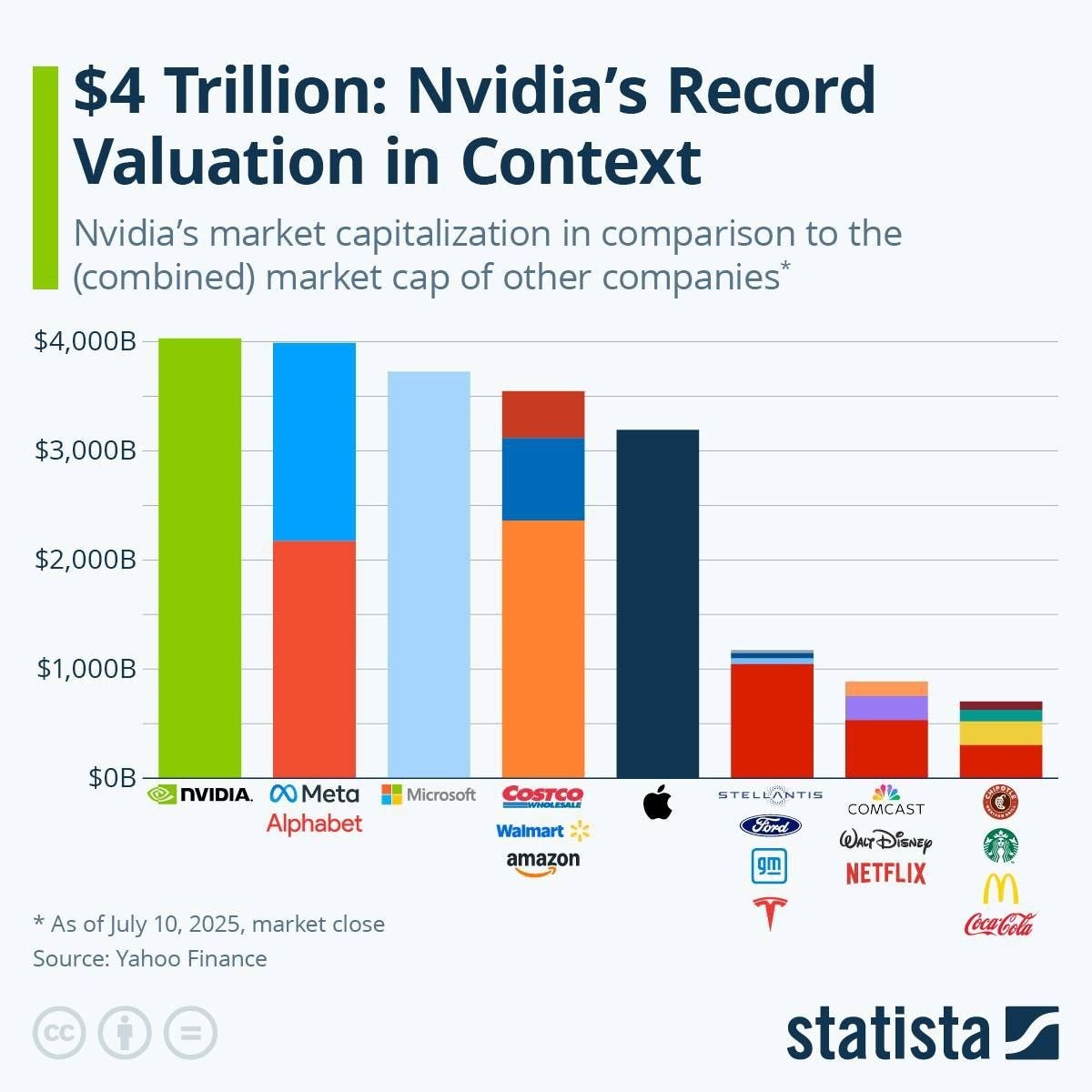 Nvidia's ascent has been historic. In early July 2025, it became the first public company in history to achieve a $4 trillion market capitalization, a milestone that underscores its critical importance to the global economy. This valuation surpasses the GDP of major economies like Japan and India and is greater than the combined value of the entire Canadian and Mexican stock markets.