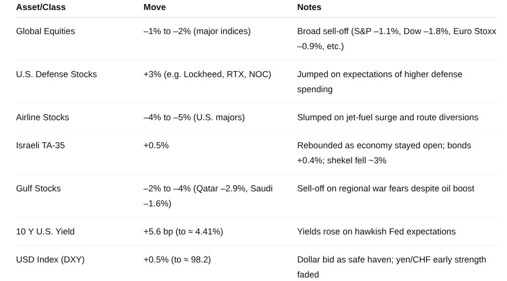Gold jumped ~1.4% toward record highs and the U.S. dollar rose ~0.5% (DXY ~98.2). Global equities sold off (S&P 500 –1.1%, Euro Stoxx –0.9%, MSCI Asia ~–1%) on June 13, led by energy-importing sectors. Defense stocks surged >3%, while airlines plunged 4–5% on fuel cost and route concerns. Bond markets saw yields whipsaw: U.S. 10-year yields rose ~6 bps (to ~4.41%) as oil-driven inflation fears outweighed initial flight-to-quality demand.