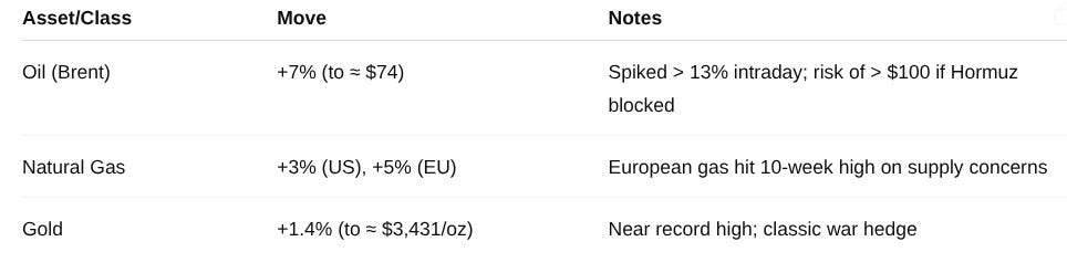 Brent crude spiked ~7% on the initial attacks (briefly +13% intraday), reflecting fears of supply disruption through the Strait of Hormuz–a chokepoint for ~20% of global oil. A further escalation (e.g. an Iranian blockade of Hormuz) could drive oil >$100, rekindling CPI inflation and delaying expected Fed/ECB rate cuts.
