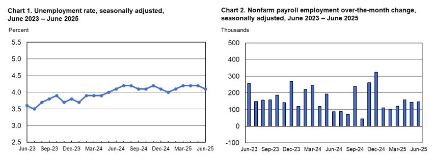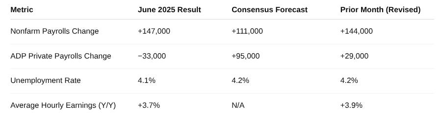 However, just one day later, on July 3, the official Bureau of Labor Statistics Employment Situation Summary delivered a much stronger message. The headline Nonfarm Payrolls figure showed a net gain of 147,000 jobs in June, comfortably beating the consensus forecast of 111,000. Furthermore, the unemployment rate ticked down slightly to 4.1%, remaining within the narrow 4.0% to 4.2% range it has occupied for over a year. The BLS also revised the figures for the prior two months upward by a combined 16,000 jobs, adding to the report's positive tone. This well-documented potential for divergence between the two reports underscores that they measure the labor market through different methodologies, with the government-led BLS survey providing a broader picture that includes public sector employment.