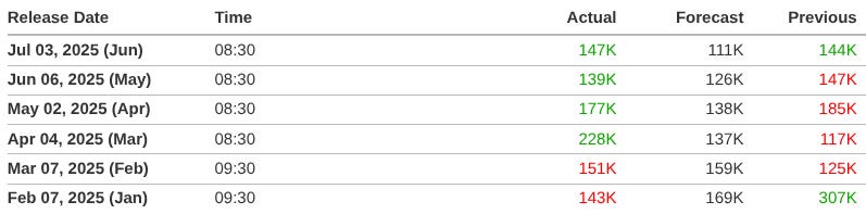 In the moments following the 8:30 a.m. ET release of the jobs data on July 3rd, interest rate futures markets moved swiftly to price out the possibility of a near-term rate cut. According to data from the CME FedWatch Tool, which analyzes 30-Day Fed Fund futures prices to derive market-implied probabilities, the odds of a 25-basis-point cut at the July 30, 2025, FOMC meeting collapsed.