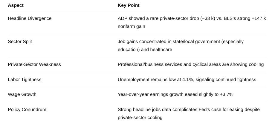 This composition is critical. The strong headline NFP number was propped up by sectors that are less sensitive to the economic cycle and changes in interest rates. The weakness reported by ADP in private sector areas like professional and business services (-56,000) and its conflicting reading on education/health services (-52,000) highlights a two-tiered labor market. While the private, cyclical part of the economy shows signs of fatigue, the non-cyclical public and quasi-public sectors are demonstrating significant strength. This dynamic creates a policy conundrum for the Federal Reserve, as the robust headline figure makes it difficult to justify monetary easing, even if the underlying private sector is cooling.