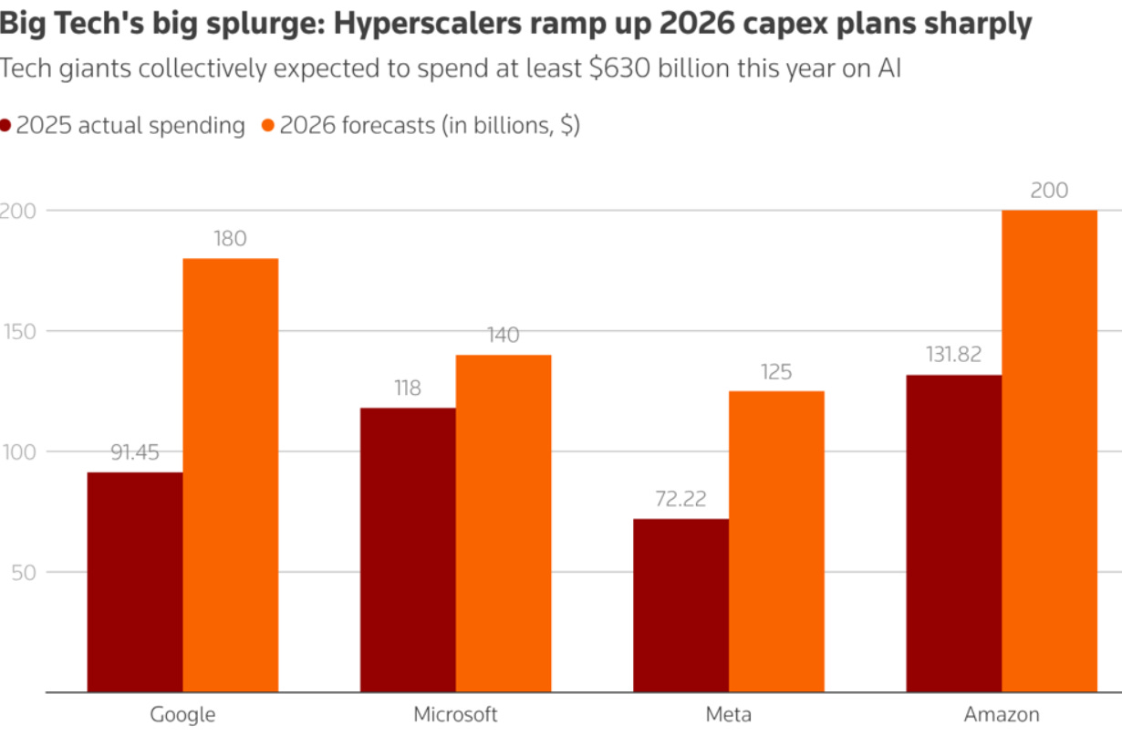 Major U.S. tech firms plan ~$630–650 billion in 2026 capital expenditures – to build AI data centers and infrastructure – a ~36% jump that is squeezing profits and alarming investors. This unprecedented AI arms race investment by Amazon, Alphabet, Meta, and others is shifting these companies from asset-light models to asset-intensive ones.