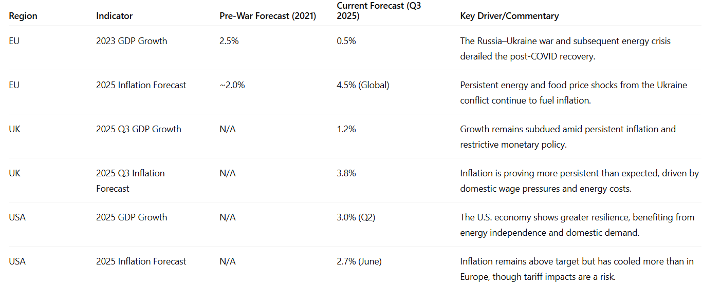 The economic consequences for Europe have been severe. The war triggered a massive commodity market shock, disrupting the supply of energy, food, metals, and fertilizers from a critical global breadbasket and industrial supplier. This disruption has been a primary driver of persistent inflation across the continent. The European Commission's forecasts starkly illustrate this impact: projected EU GDP growth for 2023 was revised down from 4.3% before the war to a mere 0.5%.