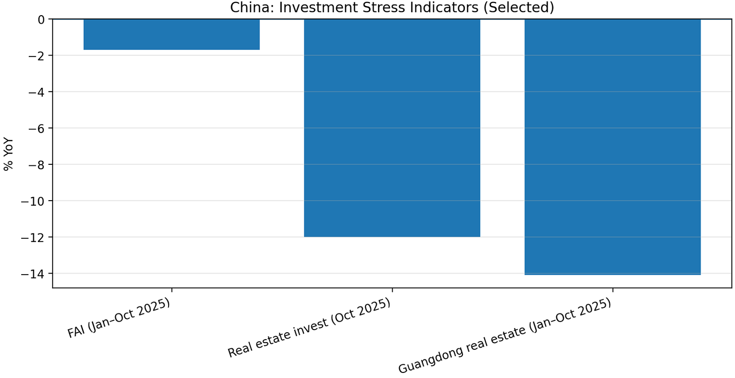 Manufacturing investment and private sector investment have been weak, squeezed by thin profits and uncertainty. Even infrastructure spending has slowed as local governments grapple with funding constraints. Regionally, China’s powerhouse provinces saw steep investment declines – e.g. Guangdong’s investment plunged 14.1% YoY in the first three quarters of 2025. Much of this industrial and investment slowdown traces back to the property sector correction and the associated debt clean-up. With property developers cutting new projects and local governments swapping debt instead of launching new ventures, demand for machinery, materials and intermediate goods has slackened. The manufacturing PMI indices in late 2025 oscillated around contraction territory, showing fragile business confidence.