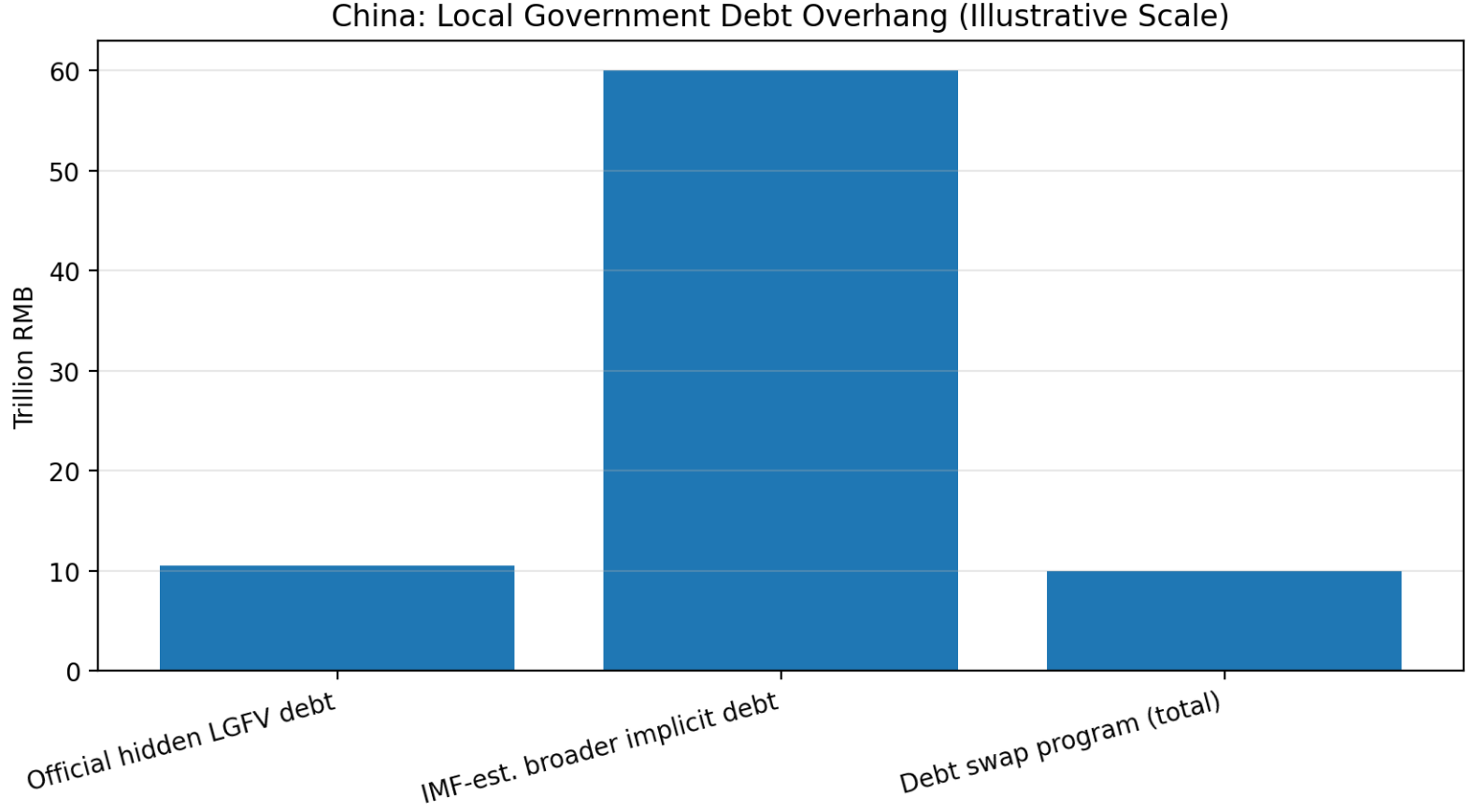 In response, Beijing launched a massive debt-resolution campaign in late 2024, approving a ¥10 trillion ($1.4 trillion) debt swap program to help provinces refinance hidden debts. Under this scheme, from 2024–2026 local governments can swap ¥2 trillion per year of shadow LGFV debt into official bonds, and additionally use special bonds for debt reduction. While this provides temporary relief, the scale of the problem is daunting. Officially reported hidden debt (mostly LGFV obligations not on government books) was ¥10.5 trillion as of end-2022. But IMF estimates peg local hidden debt at a staggering ¥60 trillion by end-2023 – roughly 48% of GDP. This implies much of the local debt burden remains unaddressed even after the swap program.