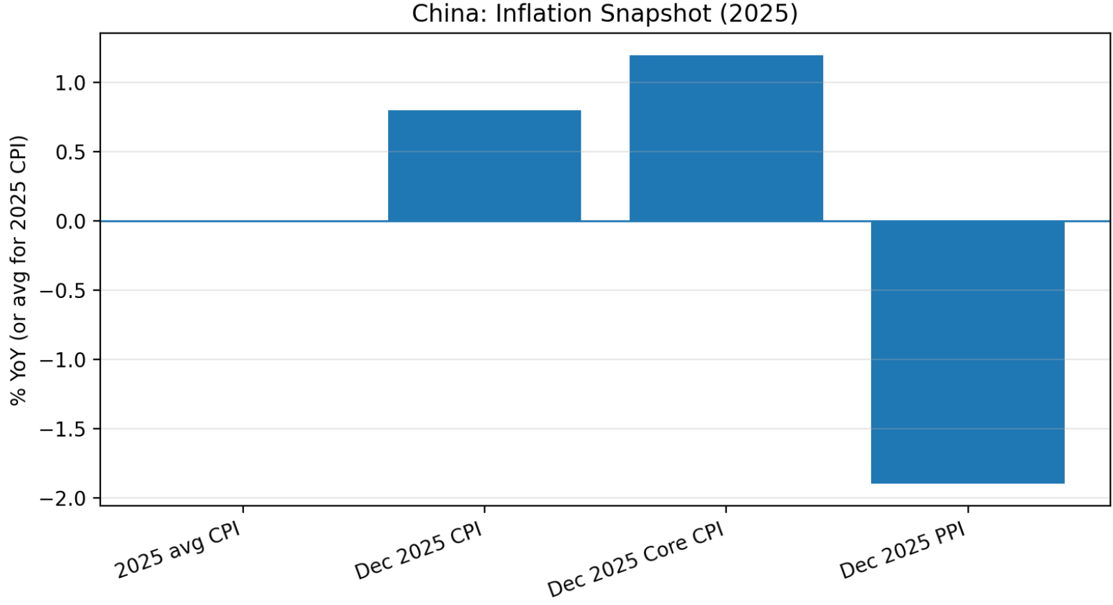 Inflation in China remains subdued, bordering on deflation for much of 2025. Consumer price inflation averaged 0.0% for full-year 2025, indicating essentially flat prices. Through most of 2025, monthly CPI prints hovered near zero, even dipping into mild deflation mid-year, before a modest uptick in the final months. By December 2025, CPI had risen only 0.8% year-on-year, the highest inflation rate in nearly three years but still low.