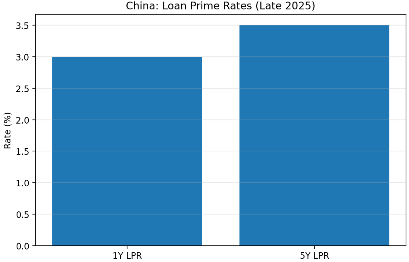 The People’s Bank of China (PBOC) has indeed maintained an accommodative monetary stance to support growth. Key benchmark rates are at or near record lows after a series of rate cuts in 2022–2023. In 2025, the PBOC shifted to a wait-and-see mode: it left the one-year and five-year Loan Prime Rates unchanged at 3.00% and 3.50% respectively for seven consecutive months through December 2025. Officials signaled that further easing will be deployed rather than in big bazookas, given that the economy was on track to meet the ~5% growth target without additional cuts.