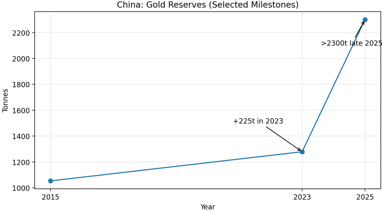 China has pursued an aggressive gold accumulation strategy as part of its reserve diversification. The People’s Bank of China quietly rebuilt gold reserves from around 1,054 tonnes in 2015 to over 2,300 tonnes by late 2025.China added 225 tonnes of gold in 2023 alone, making it the world’s largest official sector gold buyer that year. Purchases continued in 2024 and 2025 (including 21 tonnes in the first eight months of 2025). Gold now constitutes a much larger share of China’s reserves than it did a decade ago. By value, at end-2025 China’s gold hoard is worth roughly $150+ billion (with gold prices hitting record highs around $3,500/oz in 2025). The motivations are clear: gold is a tangible asset not tied to any one country’s currency, a hedge against dollar depreciation and geopolitical risks.