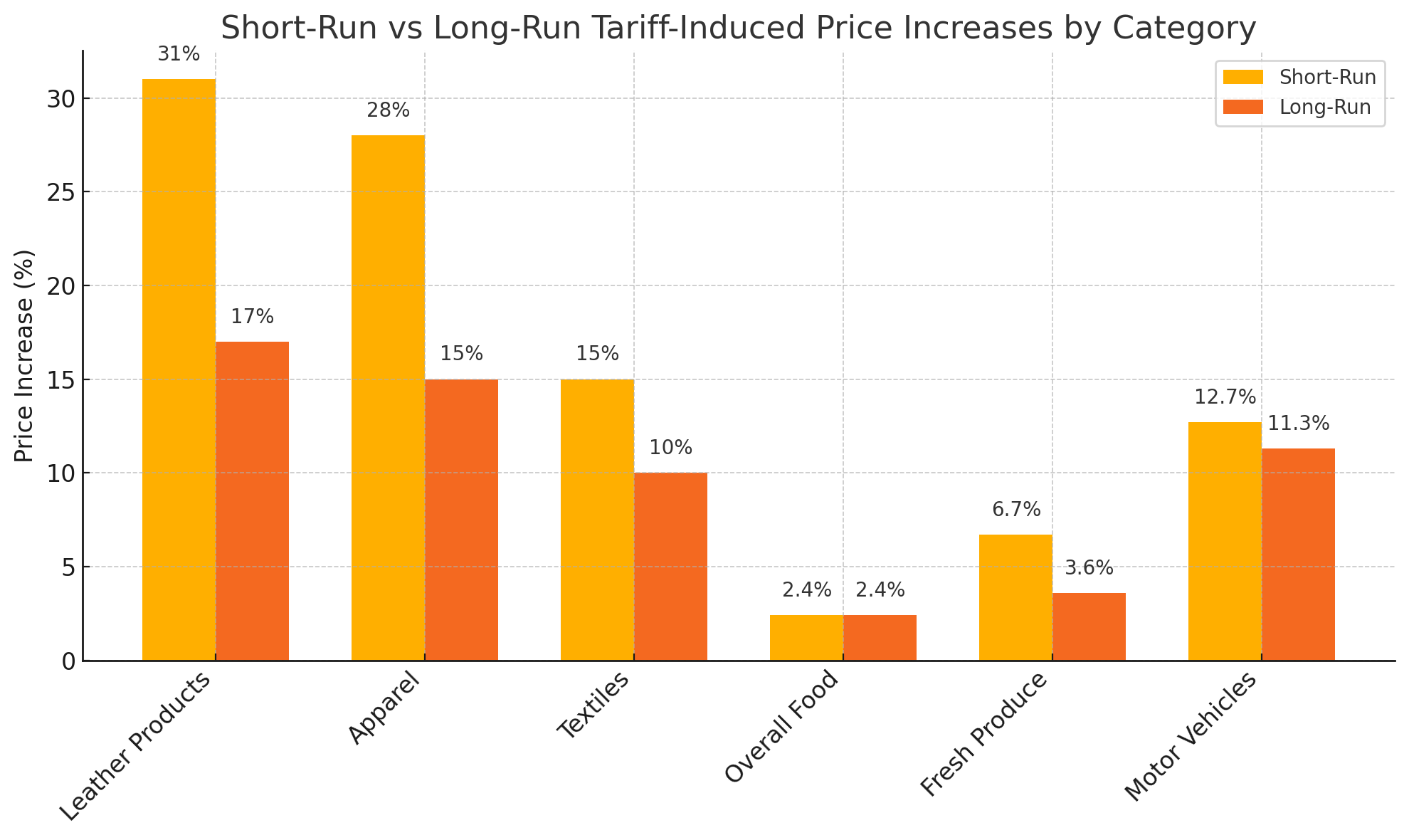 Prices for leather productsβincluding shoes and handbagsβare expected to surge by 31% in the short-run, remaining 17% higher in the long-run. Apparel prices are projected to rise by 28% in the short-run, settling at 15% higher in the long-run, while textiles could see a 15% increase in the short-run, remaining 10% higher in the long-run.
