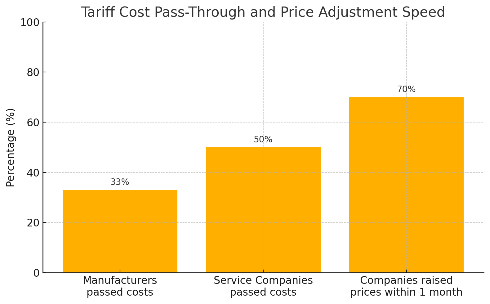 Nearly one in three manufacturers and almost half of service companies have already transferred tariff costs to their end products. A smaller, yet significant, segment of businesses has passed on an even larger portionβbetween 26% and 75%βof the tariff burden to their final prices. The speed of this pass-through is striking, with more than 70% of companies raising prices within a month or less, effectively disproving the initial expectation that businesses would simply absorb these additional costs due to their insufficient margins.