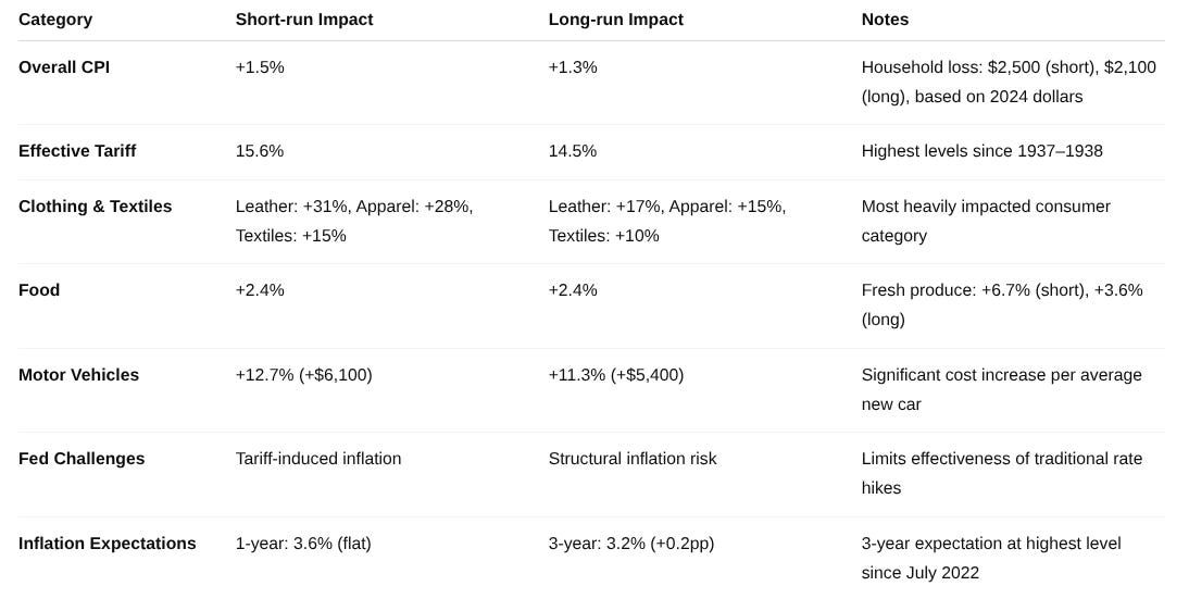 As of June 1, 2025, the overall average effective U.S. tariff rate faced by consumers stands at 15.6%, the highest observed since 1937. This is projected to cause a 1.5% rise in the overall price level in the short-run, equivalent to an average per household consumer loss of $2,500 in 2024 dollars. Even after consumption shifts, the average tariff rate is estimated to remain at 14.5%, the highest since 1938, resulting in a long-run price increase of 1.3% and a $2,100 loss per household.