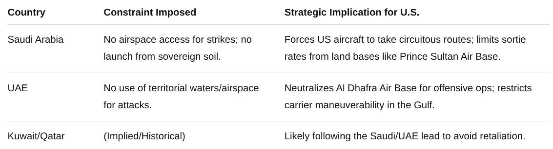 Routing complexity: To reach targets in northern or central Iran without crossing Saudi or Emirati airspace, U.S. assets must fly through Iraq (politically sensitive) or rely on long-range standoff munitions (Tomahawks) that do not require overflight permissions for pilots.