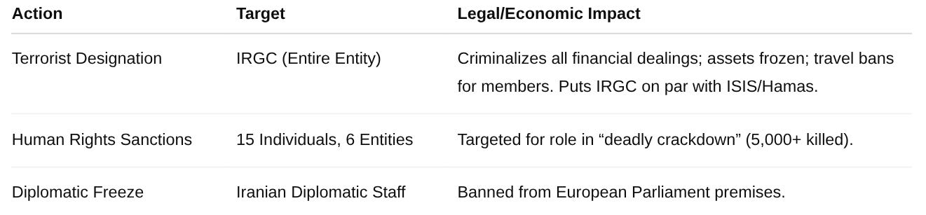 France and European leaders are moving toward sanctions related to Iranian repression and intensifying pressure on the IRGC. The EU moved toward designating Iran’s Revolutionary Guard as a terrorist organizn France’s position, alongside approval of new sanctions targeting individuals and entities linked to protest suppression and support to Russia.