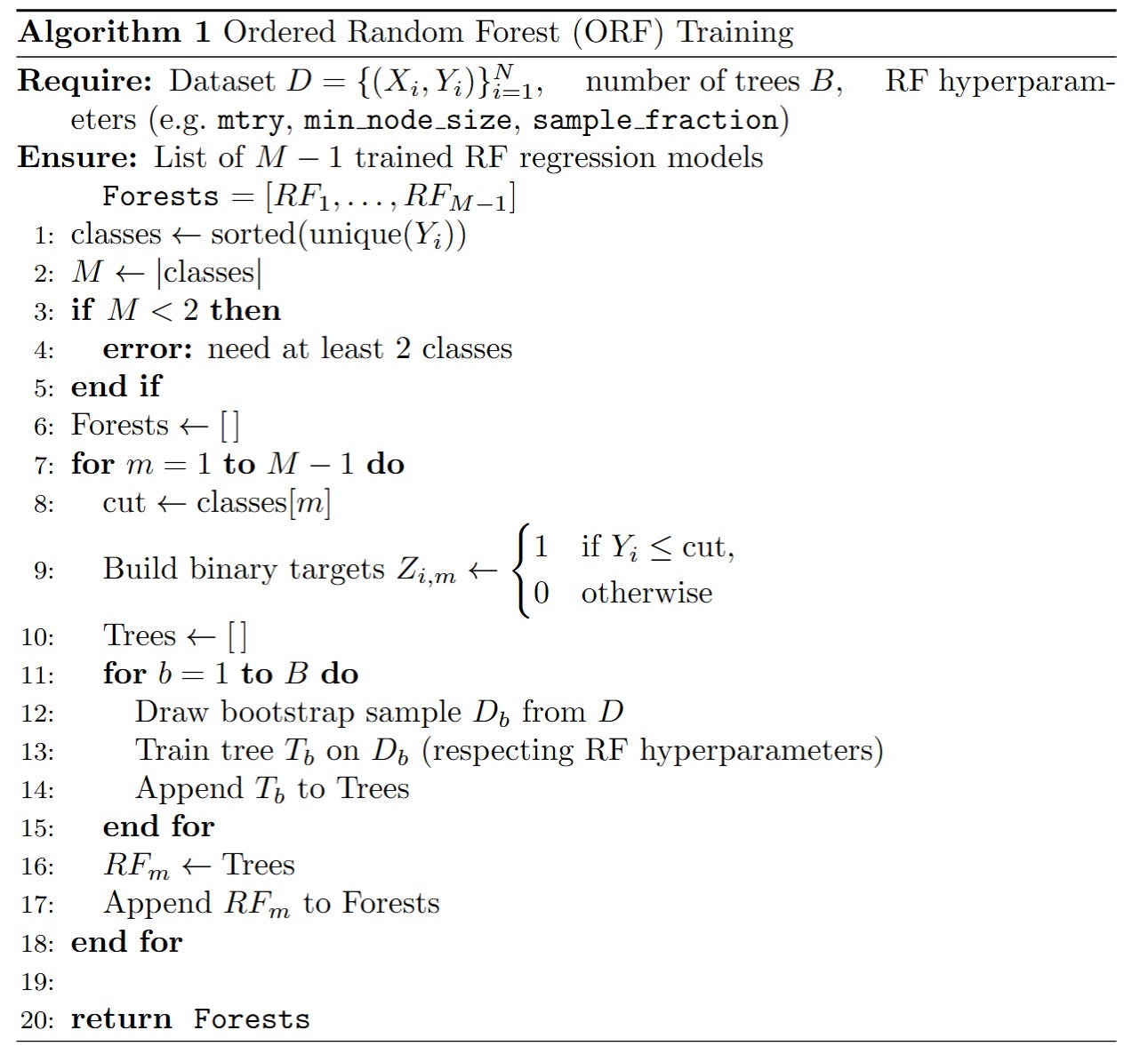 This is achieved by training Mβ1 separate random forests. The m-th forest is trained to predict the binary outcome I(Yiiββ€cmβ β), where I(β ) is the indicator function.
