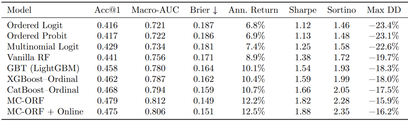 Further contribute ~2β―pp lift in MacroβAUC and sharp risk reduction, validating the economic prior of ordered cumulative links.
