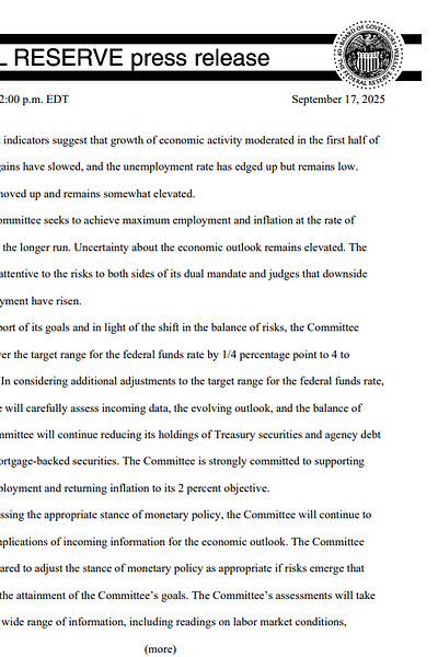That era is now over. What we are entering is not a continuation of the old paradigm with slightly different parameters, but a new monetary regime defined by contradictions, fragility, and constraints that fundamentally alter the investment landscape. The linchpin of this transition is the Federal Reserve’s September 2025 pivot: the first rate cut in nearly a year, executed not from a position of confidence but as a concession to worsening conditions. The Fed has framed this as a “risk-management” cut, yet the subtext is unavoidable—its priorities have shifted, its independence is under question, and its traditional playbook no longer fits the economic reality it confronts.